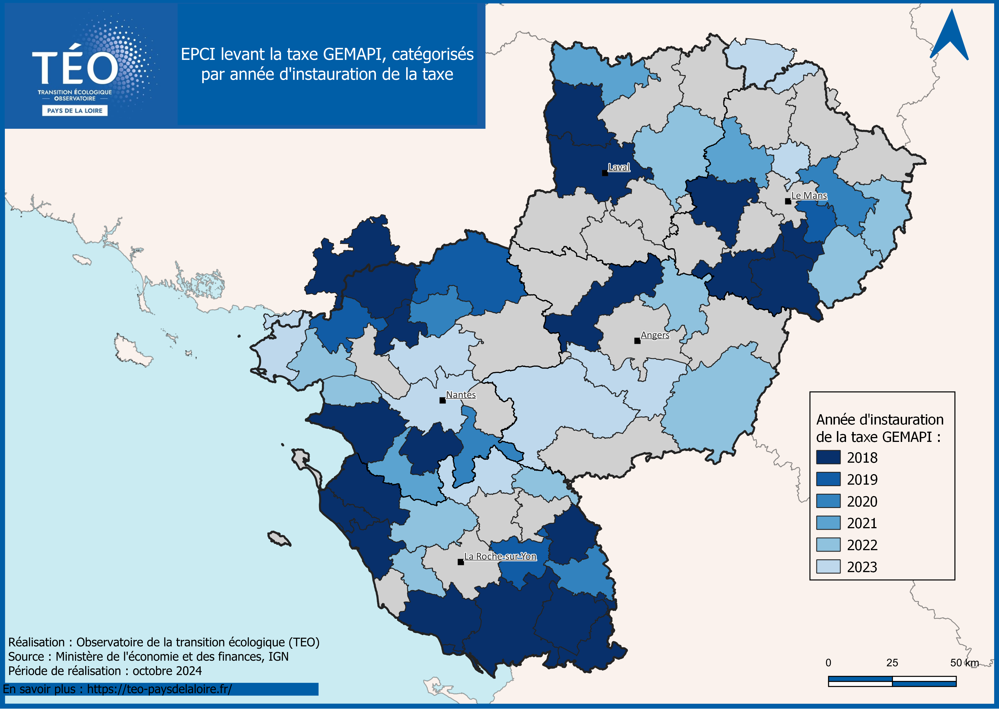 En Pays de la Loire, certains EPCI ont mis en place le prélèvement de la taxe GEMAPI. Une enveloppe est votée par l’intercommunalité chaque année avant le 15 avril, puis est répartie entre les habitants assujettis à la taxe foncière.